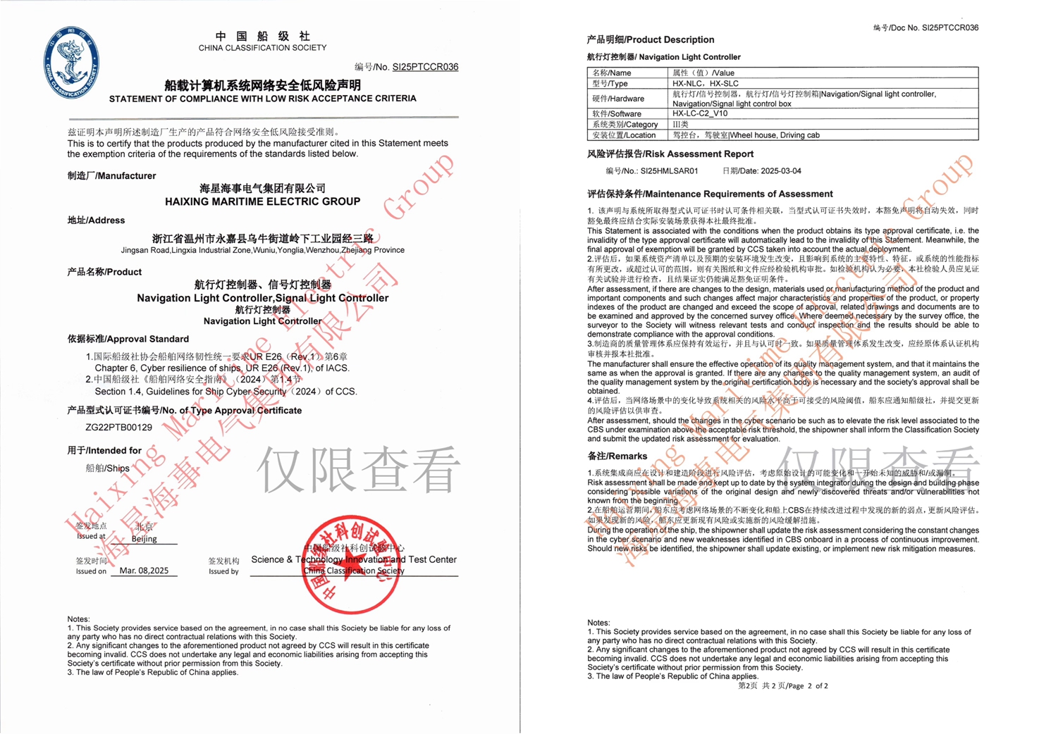 中國船級社(CCS)作為國際船級社協(xié)會(IACS)核心成員,是全球航運業(yè)網(wǎng)絡安全標準的制定者與引領(lǐng)者。其發(fā)布的??《船載計算機系統(tǒng)網(wǎng)絡安全低風險聲明》??認證,是基于 ??UR E26(Rev.1)國際統(tǒng)一要求和中國《船舶網(wǎng)絡安全指南(2024)》??構(gòu)建的權(quán)威評估體系,獲得這一項網(wǎng)絡安全認證,意味著海星集團的航行燈控制器、信號燈控制器產(chǎn)品在專業(yè)性、安全性和可靠性等方面都達到了國際先進水平。